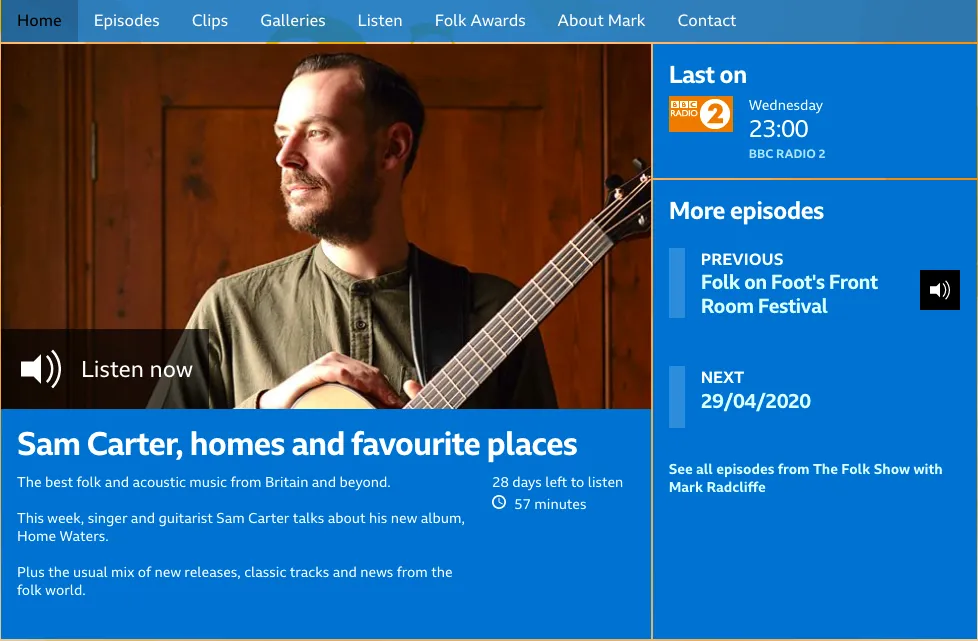 If you didn’t catch Sam in conversation with Mark Radcliffe on the BBC Radio 2 Folk Show on Wednesday night, head over to iPlayer to listen again. Mark play 3 songs from Sam’s forthcoming album Home Waters, which is released next Friday, 1st May.